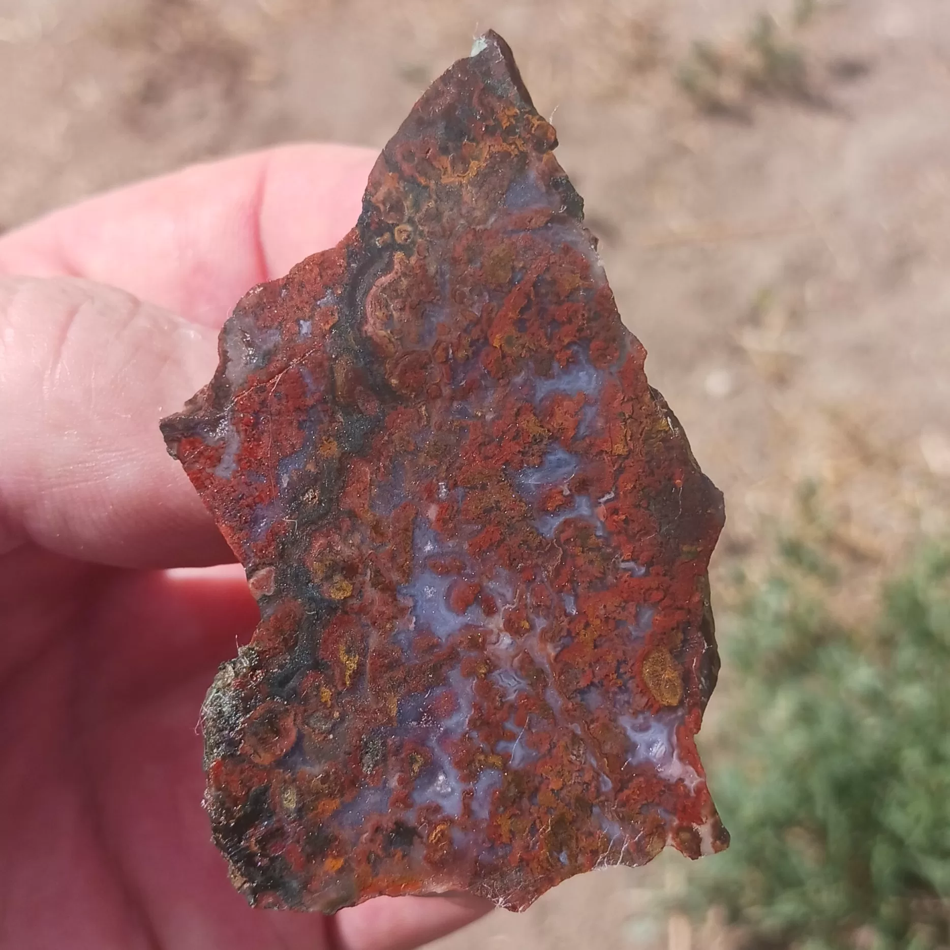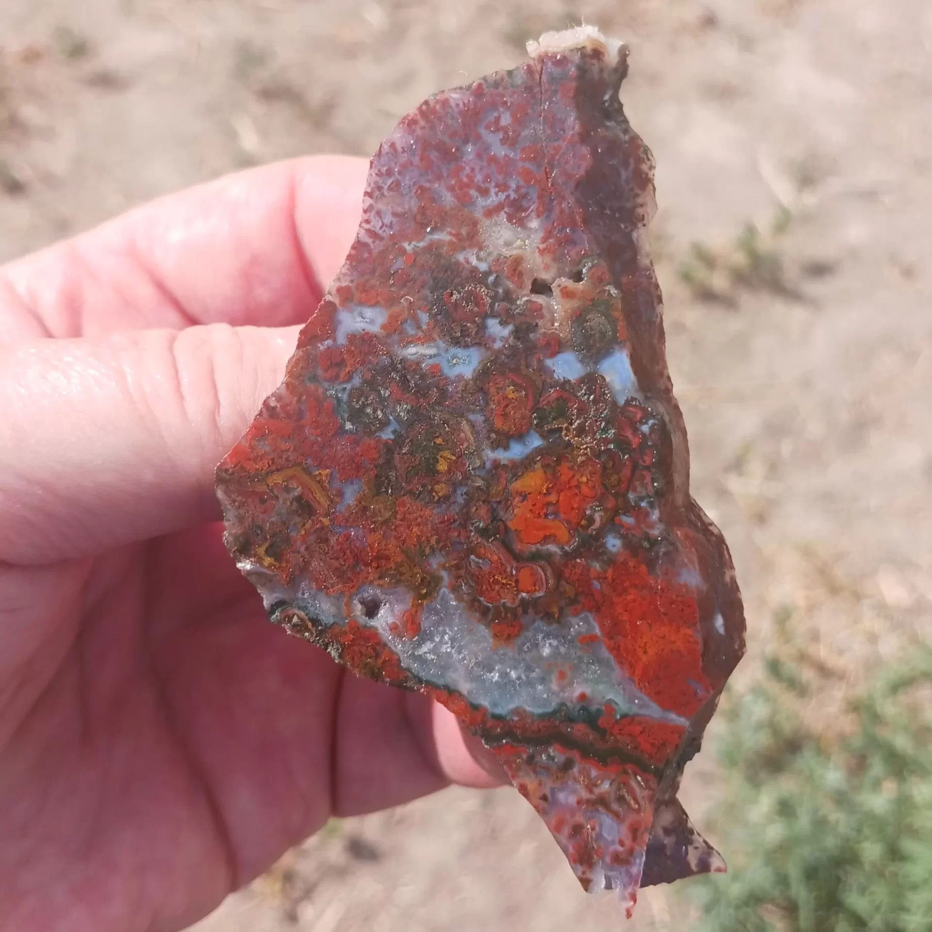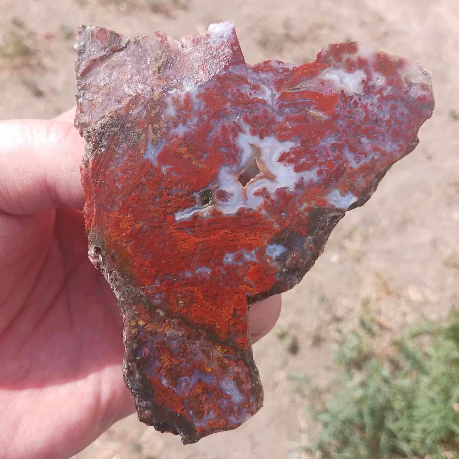 Red Lightning Agate comes from Chihuahua Mexico. It typically has beautiful raspberry red coloration that has contrasting bright white patterns. Occasionally some of this material has some green coloration. This green coloration is usually found towards the outside of the stone.