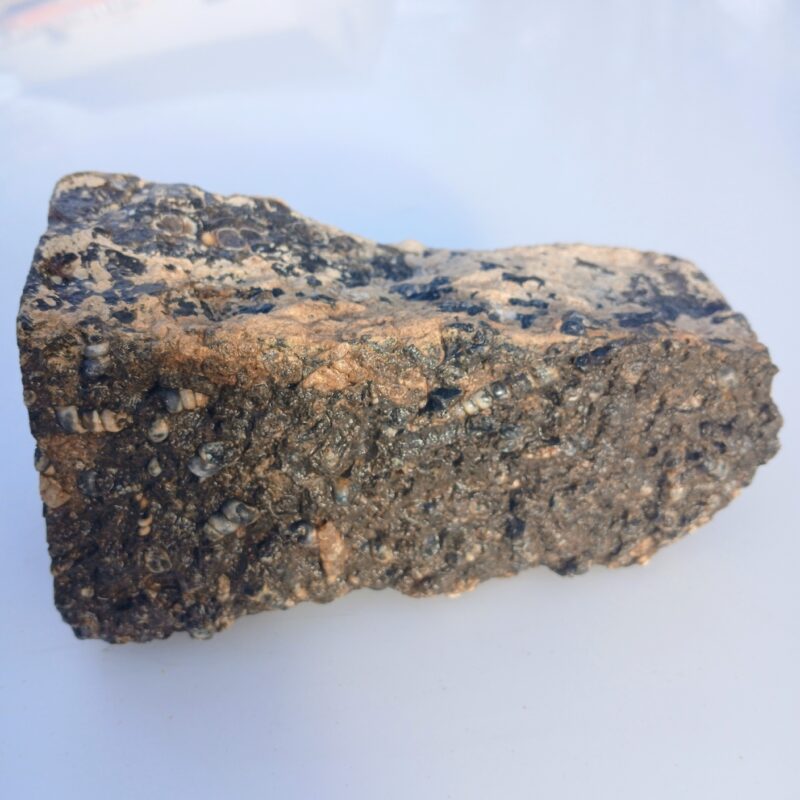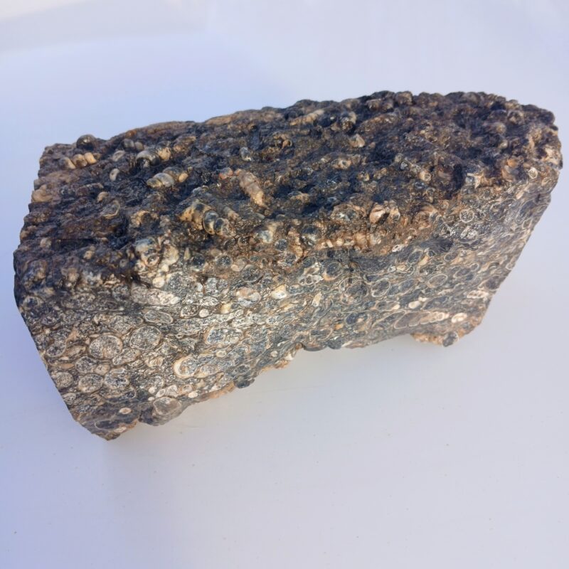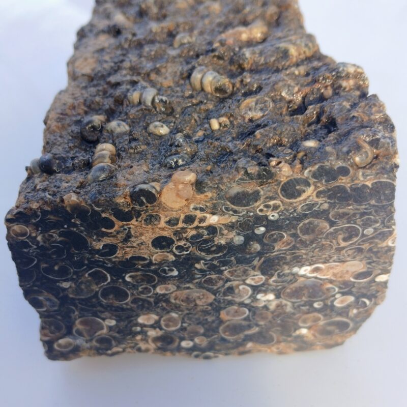 This unique agate comes from Wyoming. The black agate encases small fossilized snails which makes beautiful cabochons and lapidary slabs.