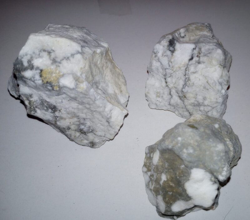 This beautiful material is marketed as White Buffalo Turquoise. First discovered by the Otteson family in 1993 near Tonopah, Nevada, this is not true turquoise but rather magnesite and alumite. We purchased this in December 2022. The largest piece in this photo is approximately 1 1/2″ square
